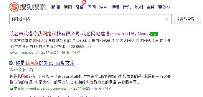 茂名市茂港你我網(wǎng)絡(luò)科技有限公司通過了搜狗官網(wǎng)認(rèn)證點擊查看